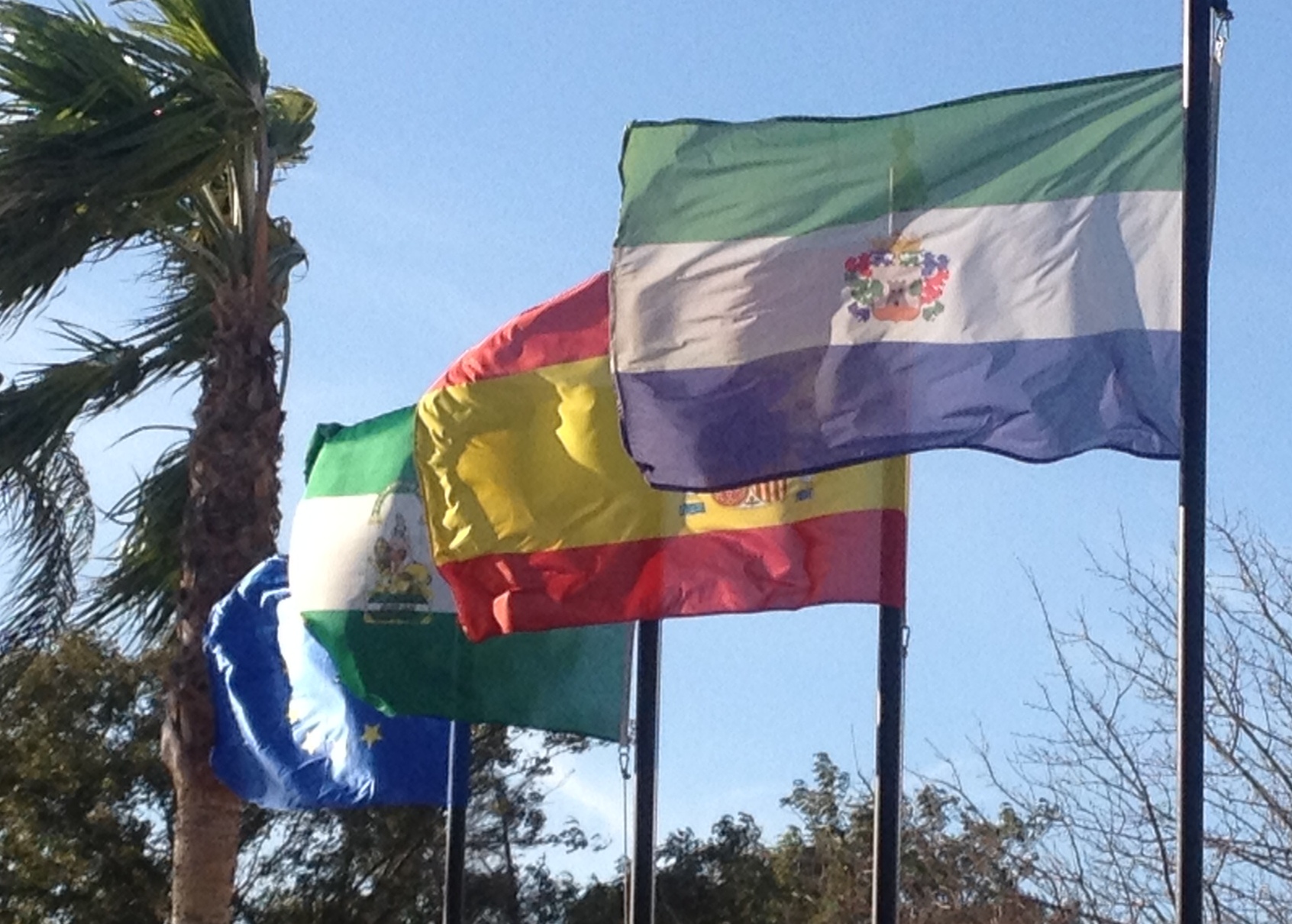 Wind whips the flags outside Town Hall